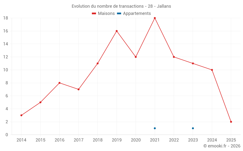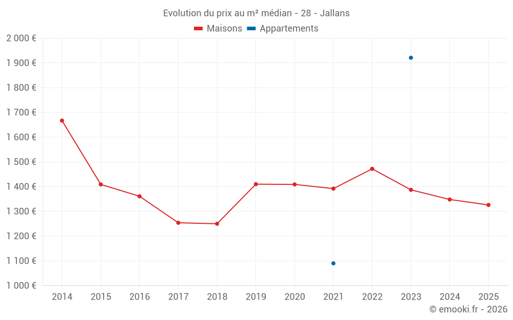 Le prix médian sur les 17 transactions de maisons des 24 derniers mois dans la commune de Jallans était de 1 360 € par mètre carré pour une valeur foncière médiane de 138 000 €. Sur cette période 60% des transactions se sont situées entre 1 160 et 1 641 € par mètre carré (du 2ème au 8ème déciles).