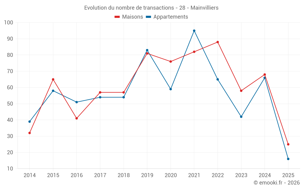 Le prix médian sur les 25 transactions de maisons des 6 derniers mois dans la commune de Mainvilliers était de 2 093 € par mètre carré pour une valeur foncière médiane de 189 000 €. Sur cette période 60% des transactions se sont situées entre 1 809 et 2 532 € par mètre carré (du 2ème au 8ème déciles).