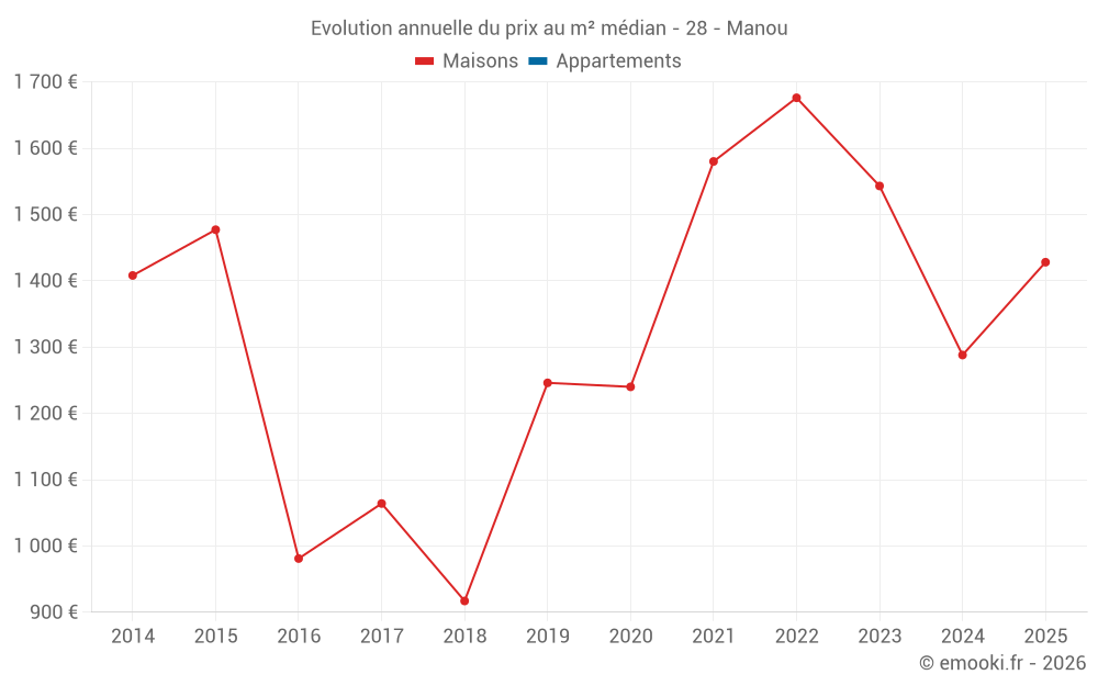 Le prix médian sur les 16 transactions de maisons des 24 derniers mois dans la commune de Manou était de 1 342 € par mètre carré pour une valeur foncière médiane de 135 000 €. Sur cette période 60% des transactions se sont situées entre 1 066 et 1 848 € par mètre carré (du 2ème au 8ème déciles).