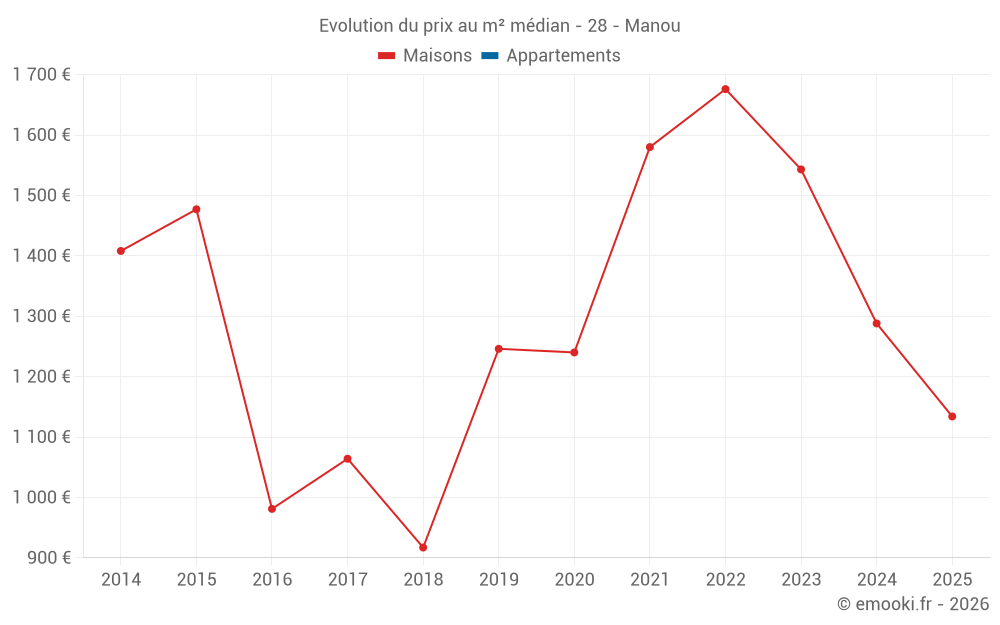 Le prix médian sur les 18 transactions de maisons des 24 derniers mois dans la commune de Manou était de 1 342 € par mètre carré pour une valeur foncière médiane de 145 900 €. Sur cette période 60% des transactions se sont situées entre 1 010 et 1 742 € par mètre carré (du 2ème au 8ème déciles).