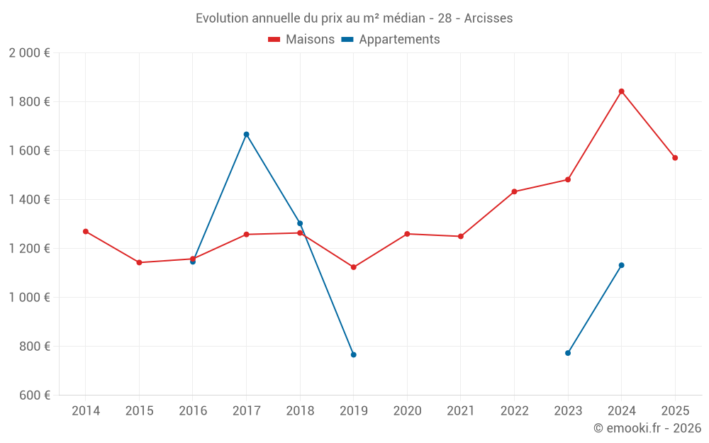 Le prix médian sur les 19 transactions de maisons des 12 derniers mois dans la commune d'Arcisses était de 1 609 € par mètre carré pour une valeur foncière médiane de 148 000 €. Sur cette période 60% des transactions se sont situées entre 1 259 et 2 497 € par mètre carré (du 2ème au 8ème déciles).