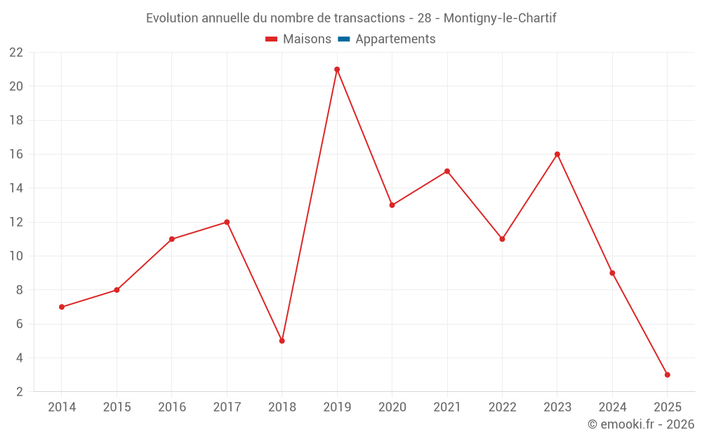 Le prix médian sur les 20 transactions de maisons des 24 derniers mois dans la commune de Montigny-le-Chartif était de 1 408 € par mètre carré pour une valeur foncière médiane de 132 500 €. Sur cette période 60% des transactions se sont situées entre 1 184 et 1 714 € par mètre carré (du 2ème au 8ème déciles).