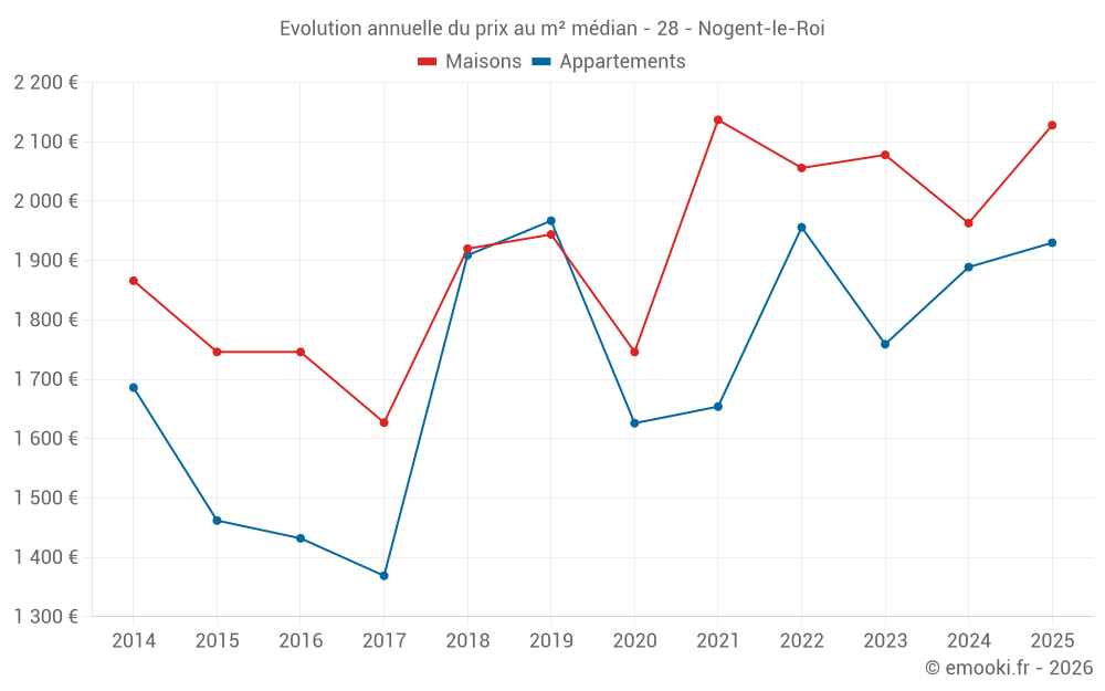 Le prix médian sur les 21 transactions d'appartements des 24 derniers mois dans la commune de Nogent-le-Roi était de 1 778 € par mètre carré pour une valeur foncière médiane de 80 000 €. Sur cette période 60% des transactions se sont situées entre 1 411 et 1 982 € par mètre carré (du 2ème au 8ème déciles).