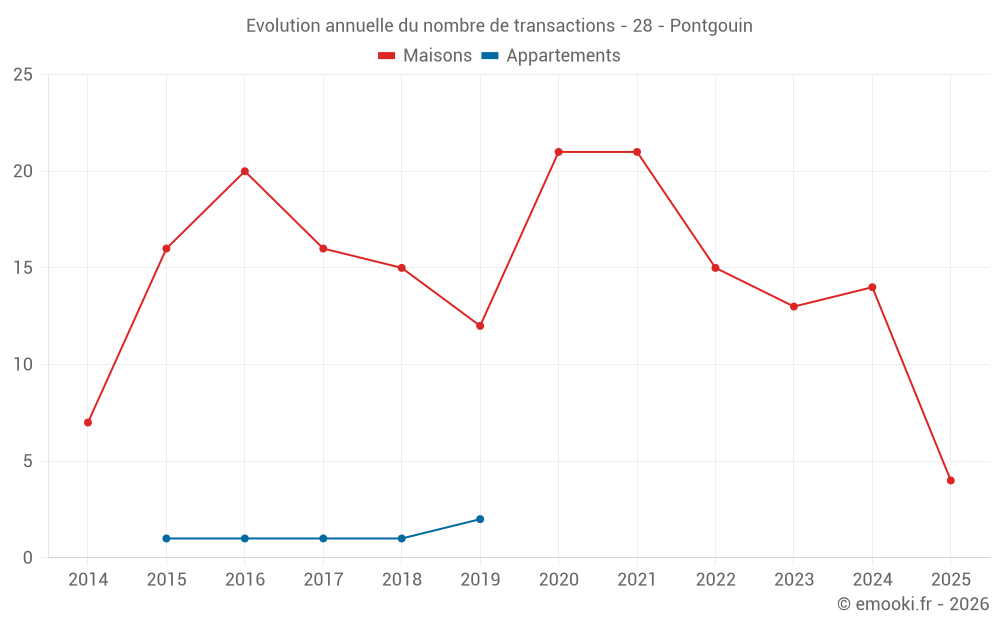 Le prix médian sur les 24 transactions de maisons des 24 derniers mois dans la commune de Pontgouin était de 1 374 € par mètre carré pour une valeur foncière médiane de 145 500 €. Sur cette période 60% des transactions se sont situées entre 1 032 et 1 915 € par mètre carré (du 2ème au 8ème déciles).