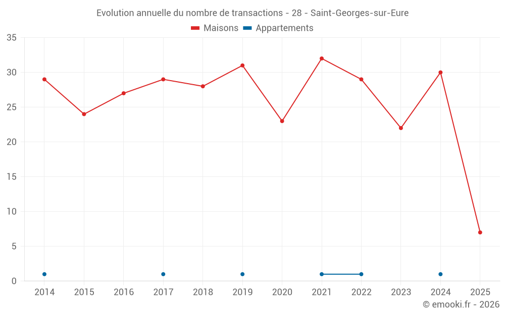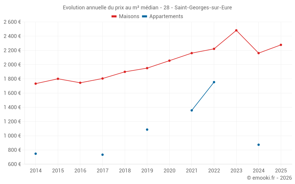 Le prix médian sur les 25 transactions de maisons des 12 derniers mois dans la commune de Saint-Georges-sur-Eure était de 2 184 € par mètre carré pour une valeur foncière médiane de 226 500 €. Sur cette période 60% des transactions se sont situées entre 1 843 et 2 642 € par mètre carré (du 2ème au 8ème déciles).