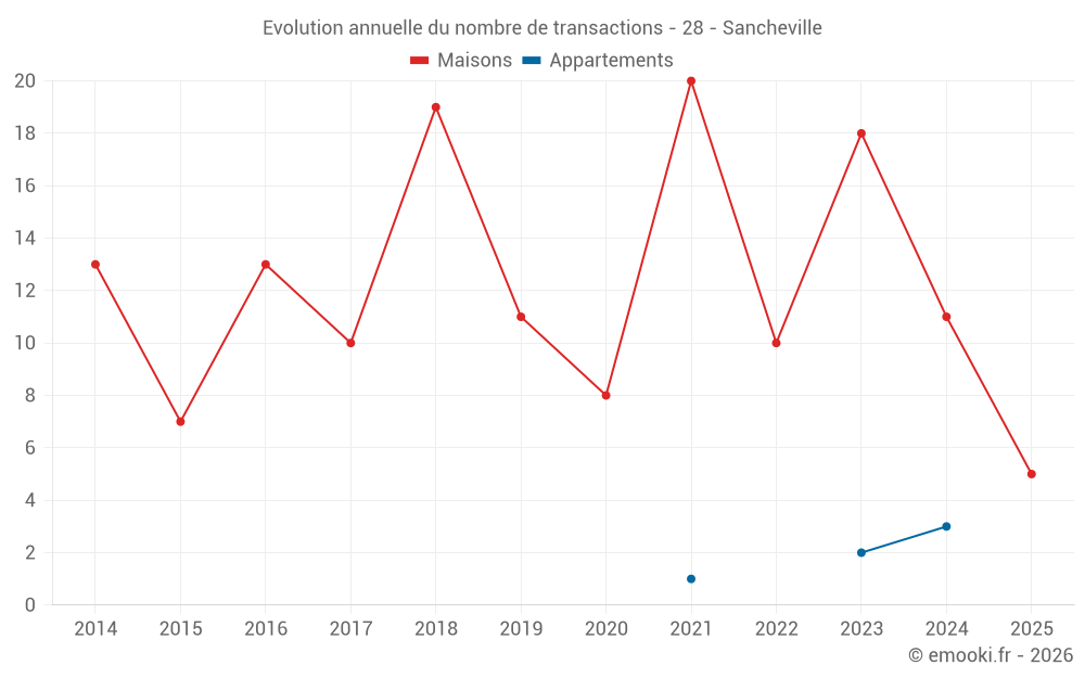 Le prix médian sur les 21 transactions de maisons des 24 derniers mois dans la commune de Sancheville était de 1 365 € par mètre carré pour une valeur foncière médiane de 98 000 €. Sur cette période 60% des transactions se sont situées entre 930 et 1 880 € par mètre carré (du 2ème au 8ème déciles).