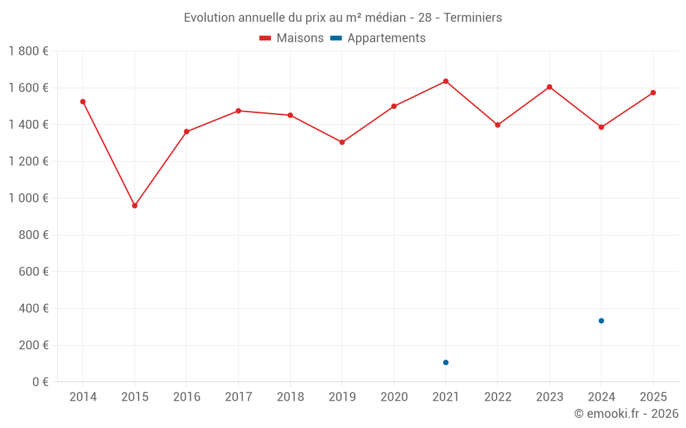 Le prix médian sur les 16 transactions de maisons des 24 derniers mois dans la commune de Terminiers était de 1 490 € par mètre carré pour une valeur foncière médiane de 129 500 €. Sur cette période 60% des transactions se sont situées entre 1 028 et 2 121 € par mètre carré (du 2ème au 8ème déciles).