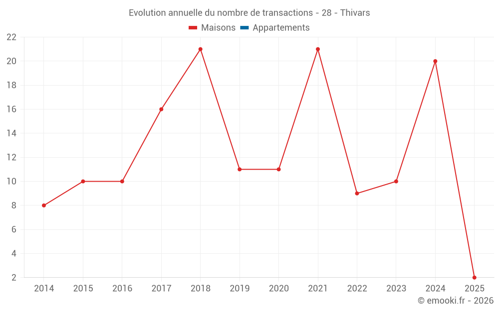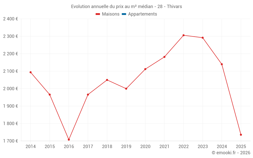 Le prix médian sur les 26 transactions de maisons des 24 derniers mois dans la commune de Thivars était de 2 041 € par mètre carré pour une valeur foncière médiane de 175 620 €. Sur cette période 60% des transactions se sont situées entre 1 213 et 2 745 € par mètre carré (du 2ème au 8ème déciles).