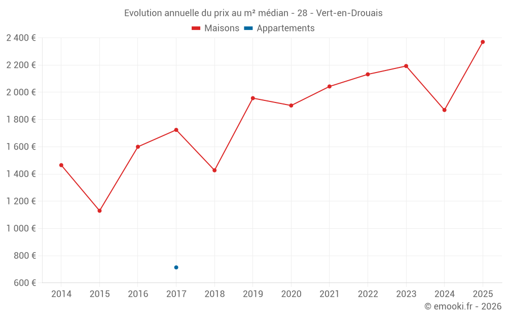 Le prix médian sur les 20 transactions de maisons des 24 derniers mois dans la commune de Vert-en-Drouais était de 2 095 € par mètre carré pour une valeur foncière médiane de 201 775 €. Sur cette période 60% des transactions se sont situées entre 1 633 et 2 378 € par mètre carré (du 2ème au 8ème déciles).