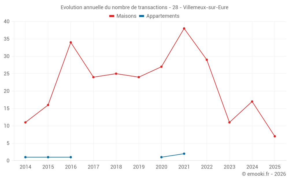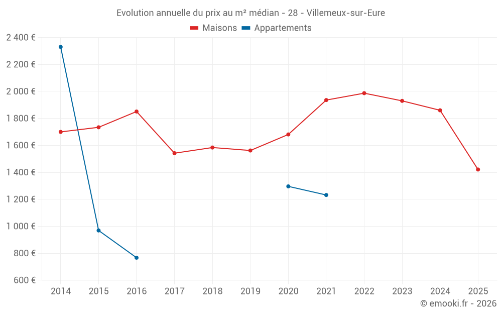 Le prix médian sur les 20 transactions de maisons des 12 derniers mois dans la commune de Villemeux-sur-Eure était de 1 841 € par mètre carré pour une valeur foncière médiane de 209 200 €. Sur cette période 60% des transactions se sont situées entre 977 et 2 338 € par mètre carré (du 2ème au 8ème déciles).