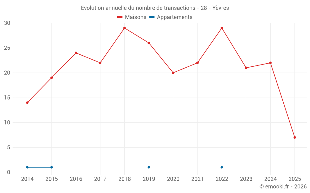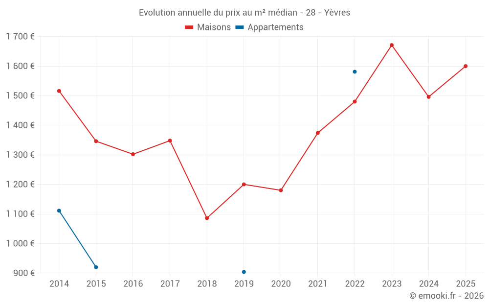Le prix médian sur les 23 transactions de maisons des 12 derniers mois dans la commune d'Yèvres était de 1 600 € par mètre carré pour une valeur foncière médiane de 128 000 €. Sur cette période 60% des transactions se sont situées entre 1 175 et 1 996 € par mètre carré (du 2ème au 8ème déciles).
