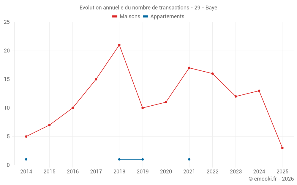 Le prix médian sur les 21 transactions de maisons des 24 derniers mois dans la commune de Baye était de 2 188 € par mètre carré pour une valeur foncière médiane de 260 000 €. Sur cette période 60% des transactions se sont situées entre 1 940 et 3 059 € par mètre carré (du 2ème au 8ème déciles).