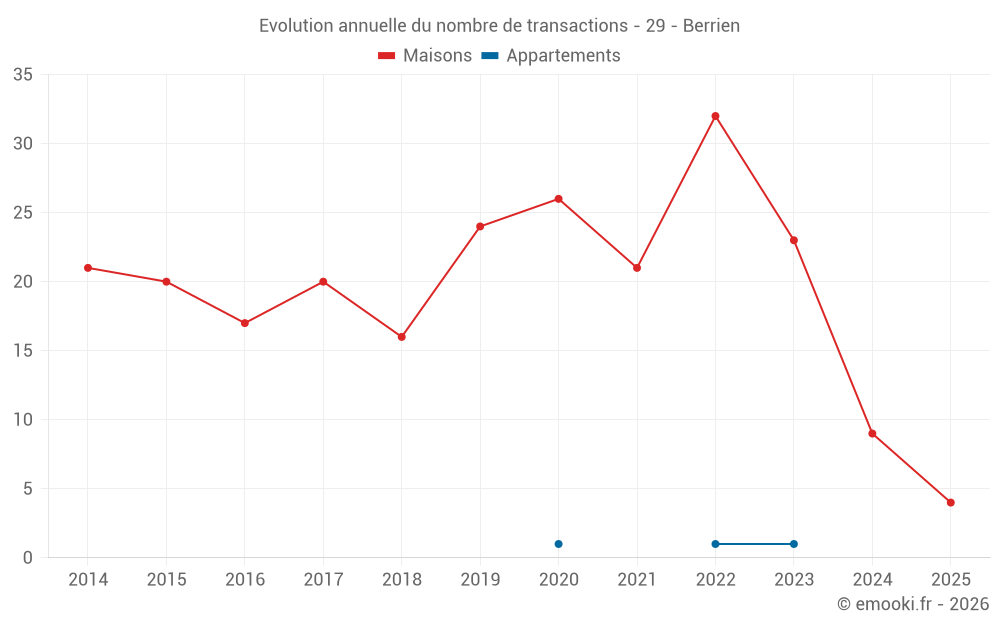 Le prix médian sur les 24 transactions de maisons des 24 derniers mois dans la commune de Berrien était de 1 166 € par mètre carré pour une valeur foncière médiane de 80 500 €. Sur cette période 60% des transactions se sont situées entre 778 et 1 794 € par mètre carré (du 2ème au 8ème déciles).
