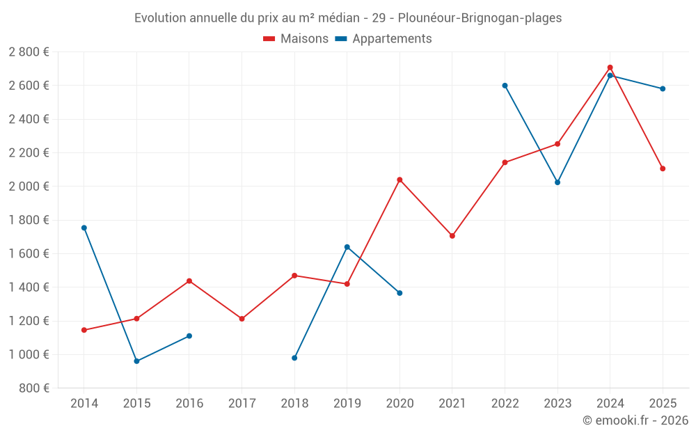 Le prix médian sur les 28 transactions de maisons des 12 derniers mois dans la commune de Plounéour-Brignogan-plages était de 1 988 € par mètre carré pour une valeur foncière médiane de 192 500 €. Sur cette période 60% des transactions se sont situées entre 1 507 et 2 778 € par mètre carré (du 2ème au 8ème déciles).