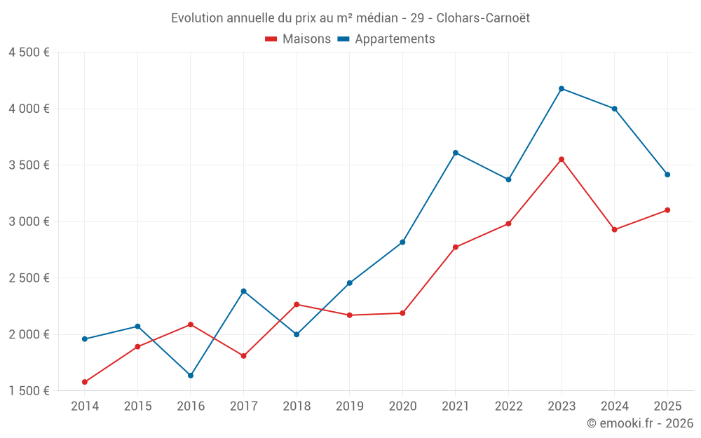 Le prix médian sur les 25 transactions de maisons des 6 derniers mois dans la commune de Clohars-Carnoët était de 3 102 € par mètre carré pour une valeur foncière médiane de 340 000 €. Sur cette période 60% des transactions se sont situées entre 2 285 et 3 918 € par mètre carré (du 2ème au 8ème déciles).