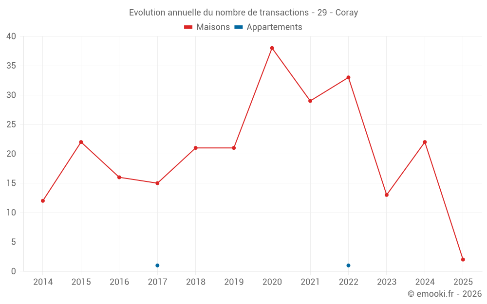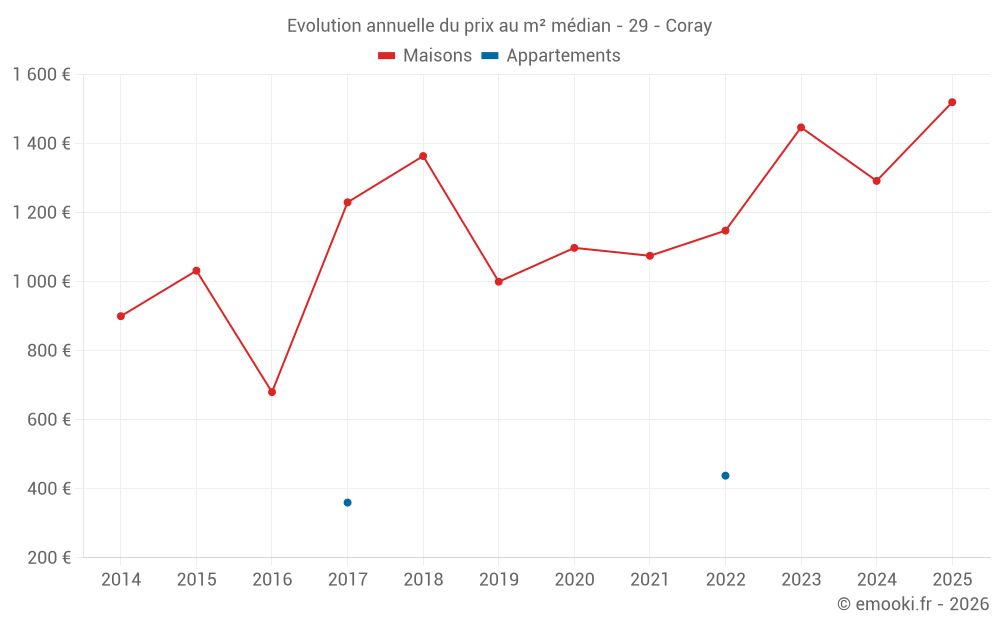Le prix médian sur les 30 transactions de maisons des 24 derniers mois dans la commune de Coray était de 1 316 € par mètre carré pour une valeur foncière médiane de 141 500 €. Sur cette période 60% des transactions se sont situées entre 804 et 1 645 € par mètre carré (du 2ème au 8ème déciles).