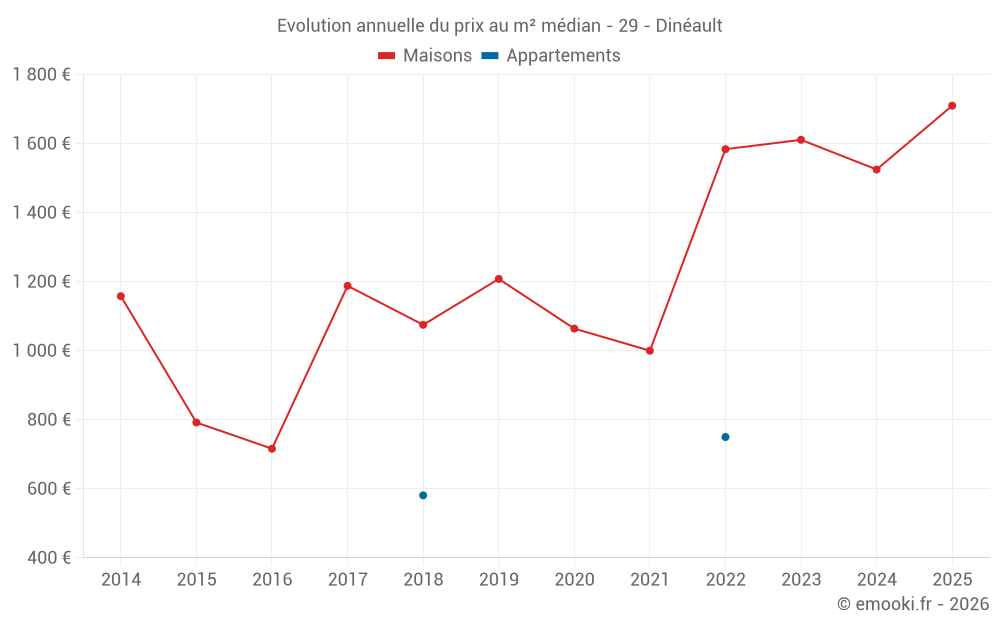 Le prix médian sur les 32 transactions de maisons des 24 derniers mois dans la commune de Dinéault était de 1 552 € par mètre carré pour une valeur foncière médiane de 155 250 €. Sur cette période 60% des transactions se sont situées entre 1 176 et 2 079 € par mètre carré (du 2ème au 8ème déciles).