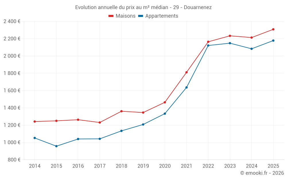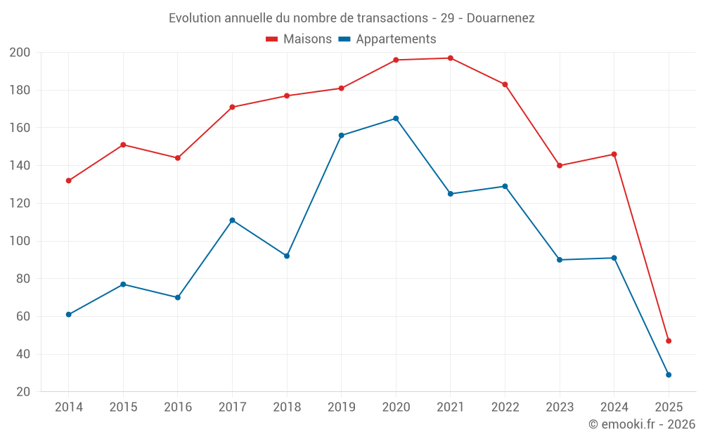 Le prix médian sur les 47 transactions de maisons des 6 derniers mois dans la commune de Douarnenez était de 2 308 € par mètre carré pour une valeur foncière médiane de 199 000 €. Sur cette période 60% des transactions se sont situées entre 1 562 et 2 841 € par mètre carré (du 2ème au 8ème déciles).