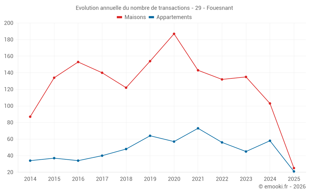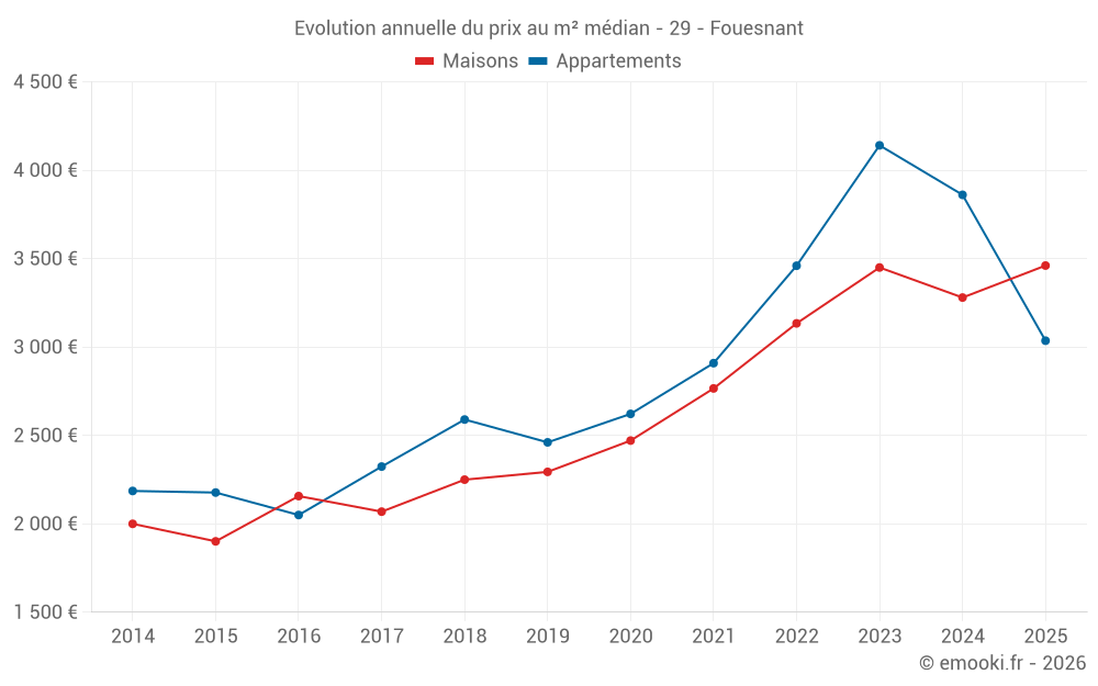 Le prix médian sur les 25 transactions de maisons des 6 derniers mois dans la commune de Fouesnant était de 3 461 € par mètre carré pour une valeur foncière médiane de 345 000 €. Sur cette période 60% des transactions se sont situées entre 2 420 et 4 656 € par mètre carré (du 2ème au 8ème déciles).