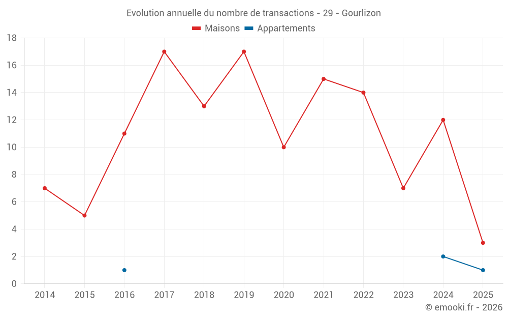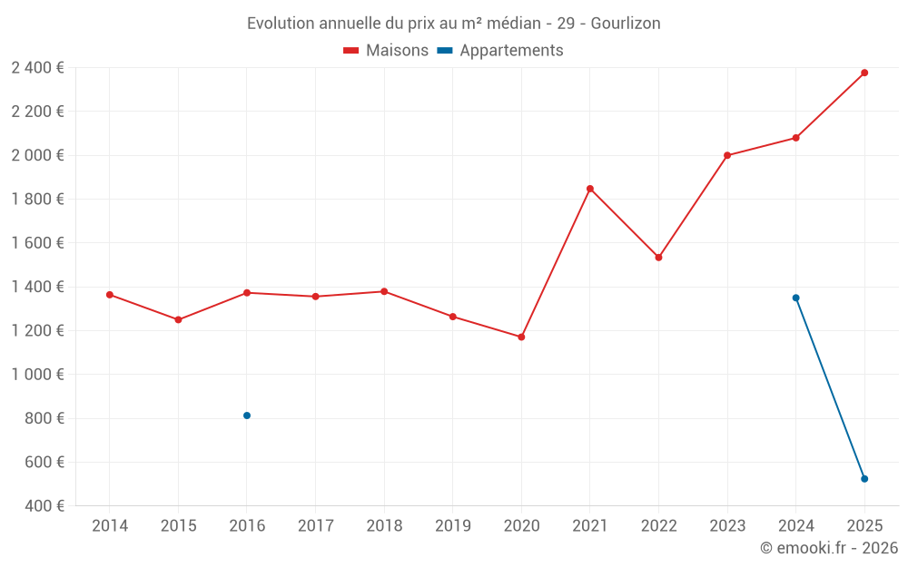 Le prix médian sur les 19 transactions de maisons des 24 derniers mois dans la commune de Gourlizon était de 2 192 € par mètre carré pour une valeur foncière médiane de 203 500 €. Sur cette période 60% des transactions se sont situées entre 1 468 et 2 542 € par mètre carré (du 2ème au 8ème déciles).