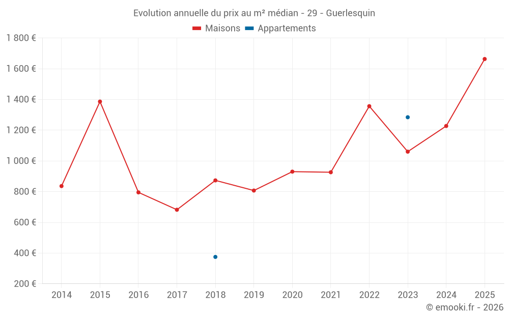 Le prix médian sur les 17 transactions de maisons des 12 derniers mois dans la commune de Guerlesquin était de 1 341 € par mètre carré pour une valeur foncière médiane de 120 000 €. Sur cette période 60% des transactions se sont situées entre 888 et 1 526 € par mètre carré (du 2ème au 8ème déciles).