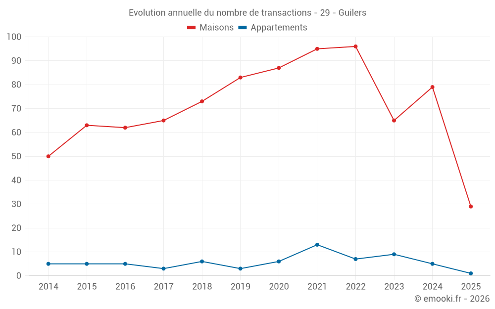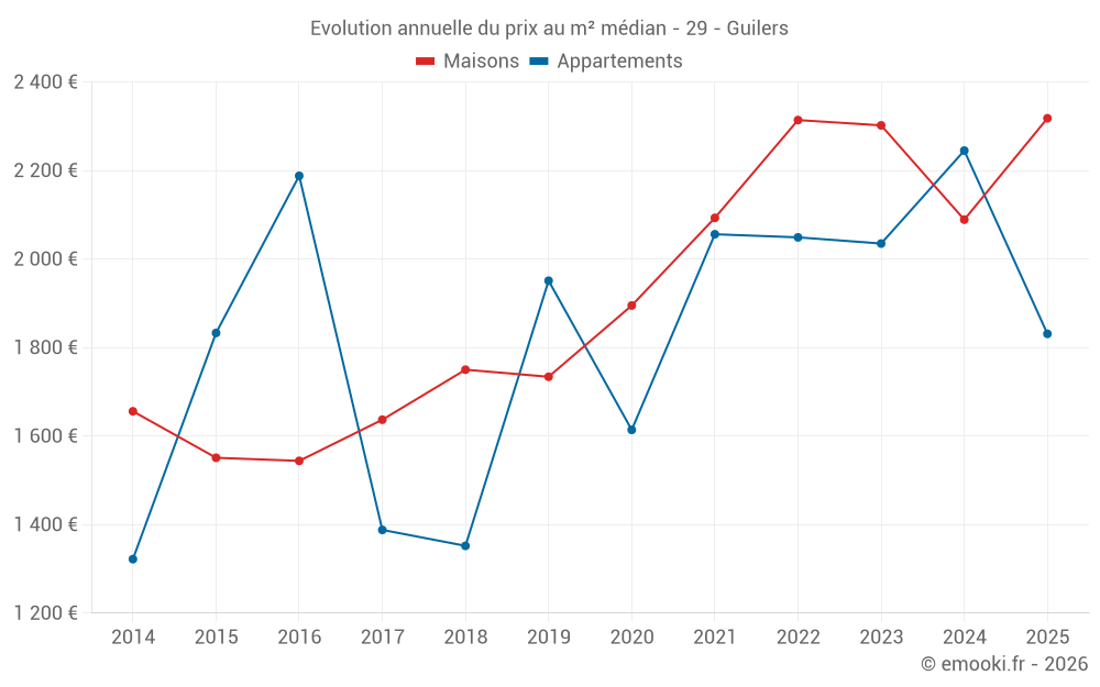 Le prix médian sur les 29 transactions de maisons des 6 derniers mois dans la commune de Guilers était de 2 318 € par mètre carré pour une valeur foncière médiane de 244 000 €. Sur cette période 60% des transactions se sont situées entre 1 808 et 2 994 € par mètre carré (du 2ème au 8ème déciles).