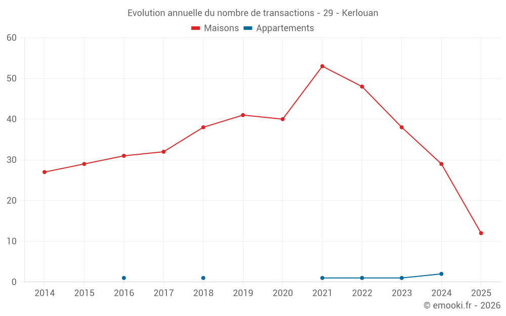 Le prix médian sur les 30 transactions de maisons des 12 derniers mois dans la commune de Kerlouan était de 1 883 € par mètre carré pour une valeur foncière médiane de 216 481 €. Sur cette période 60% des transactions se sont situées entre 1 434 et 4 198 € par mètre carré (du 2ème au 8ème déciles).