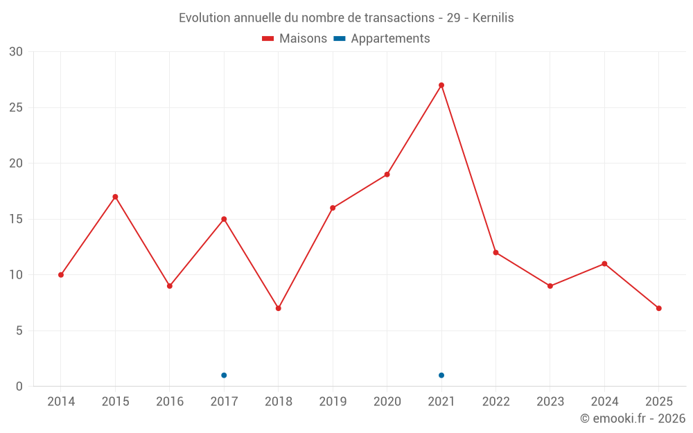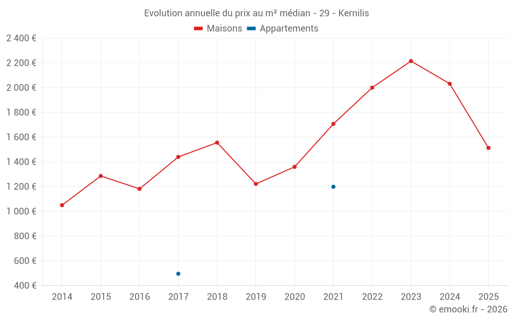 Le prix médian sur les 20 transactions de maisons des 24 derniers mois dans la commune de Kernilis était de 1 786 € par mètre carré pour une valeur foncière médiane de 185 000 €. Sur cette période 60% des transactions se sont situées entre 1 364 et 2 199 € par mètre carré (du 2ème au 8ème déciles).