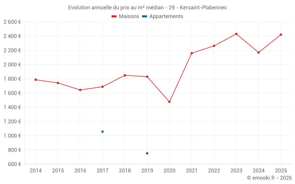 Le prix médian sur les 18 transactions de maisons des 24 derniers mois dans la commune de Kersaint-Plabennec était de 2 201 € par mètre carré pour une valeur foncière médiane de 230 000 €. Sur cette période 60% des transactions se sont situées entre 1 551 et 2 851 € par mètre carré (du 2ème au 8ème déciles).