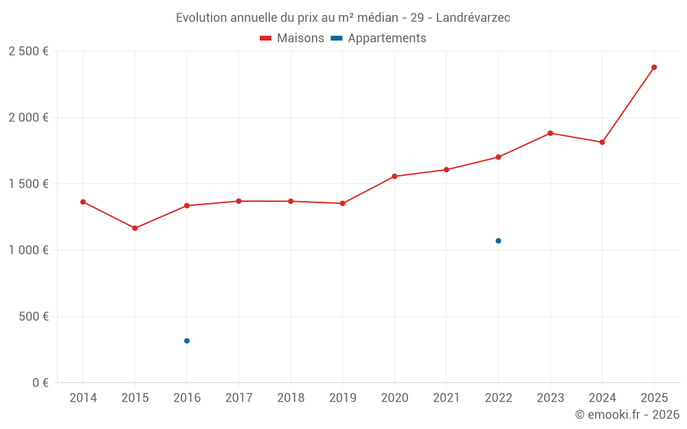 Le prix médian sur les 25 transactions de maisons des 24 derniers mois dans la commune de Landrévarzec était de 1 801 € par mètre carré pour une valeur foncière médiane de 200 000 €. Sur cette période 60% des transactions se sont situées entre 1 245 et 2 377 € par mètre carré (du 2ème au 8ème déciles).