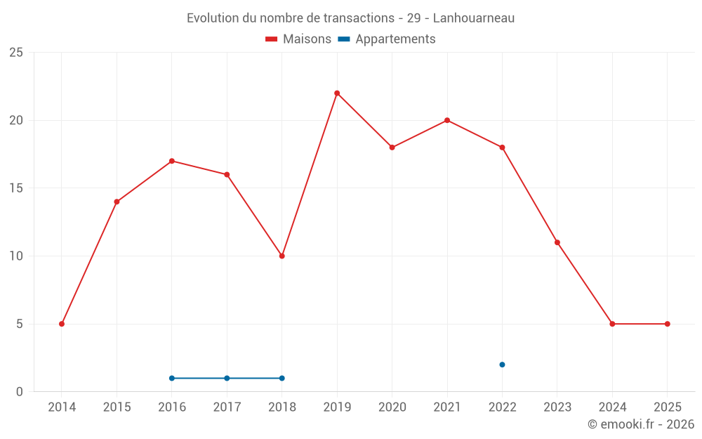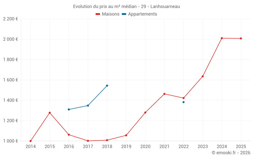Le prix médian sur les 15 transactions de maisons des 24 derniers mois dans la commune de Lanhouarneau était de 1 882 € par mètre carré pour une valeur foncière médiane de 164 510 €. Sur cette période 60% des transactions se sont situées entre 811 et 2 198 € par mètre carré (du 2ème au 8ème déciles).