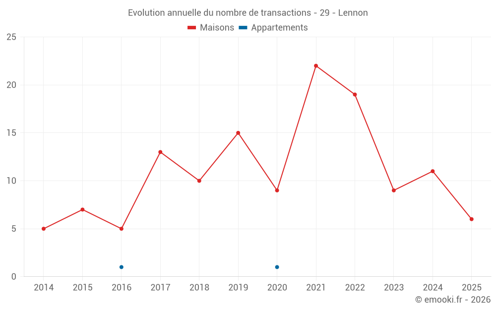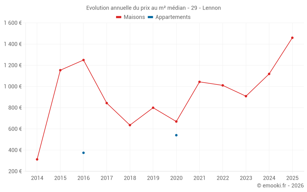 Le prix médian sur les 21 transactions de maisons des 24 derniers mois dans la commune de Lennon était de 1 186 € par mètre carré pour une valeur foncière médiane de 105 000 €. Sur cette période 60% des transactions se sont situées entre 743 et 1 731 € par mètre carré (du 2ème au 8ème déciles).