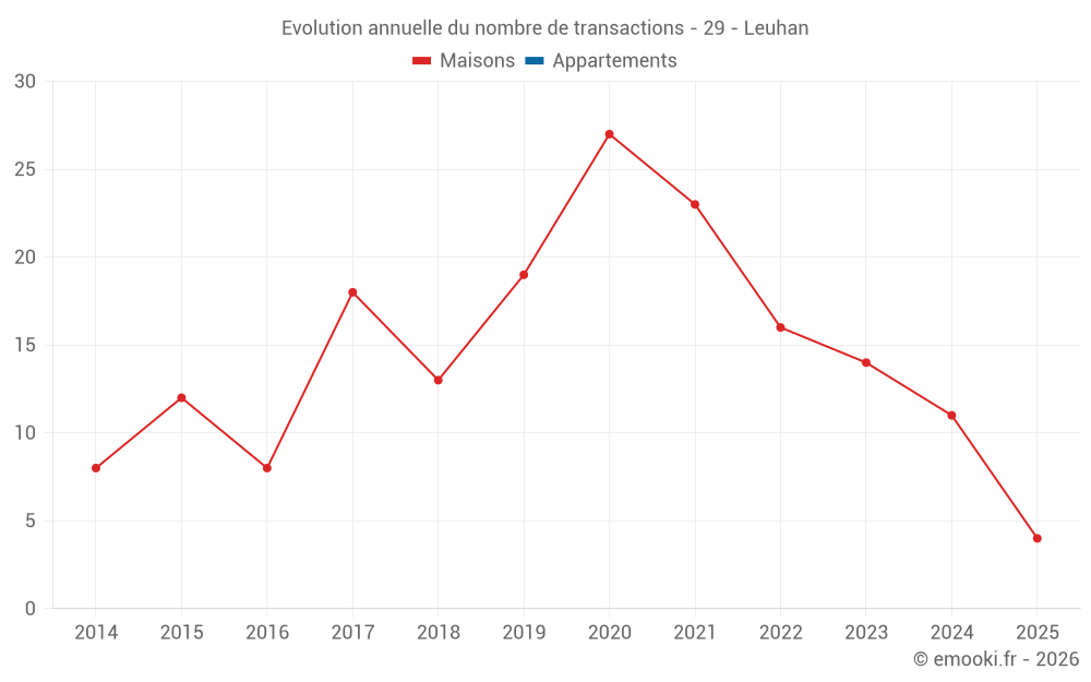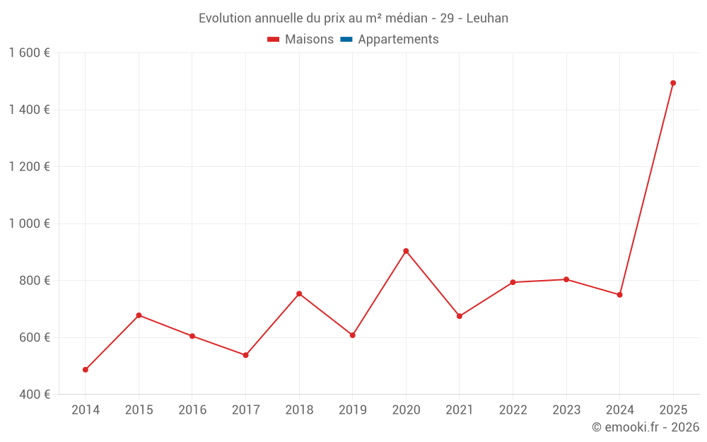 Le prix médian sur les 23 transactions de maisons des 24 derniers mois dans la commune de Leuhan était de 793 € par mètre carré pour une valeur foncière médiane de 91 324 €. Sur cette période 60% des transactions se sont situées entre 357 et 1 378 € par mètre carré (du 2ème au 8ème déciles).