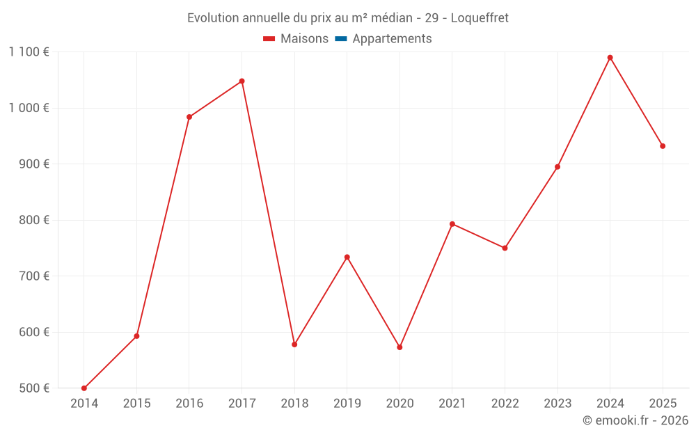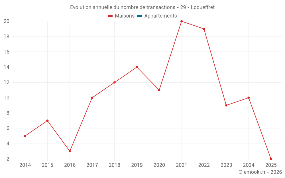 Le prix médian sur les 17 transactions de maisons des 24 derniers mois dans la commune de Loqueffret était de 1 056 € par mètre carré pour une valeur foncière médiane de 65 750 €. Sur cette période 60% des transactions se sont situées entre 501 et 1 206 € par mètre carré (du 2ème au 8ème déciles).
