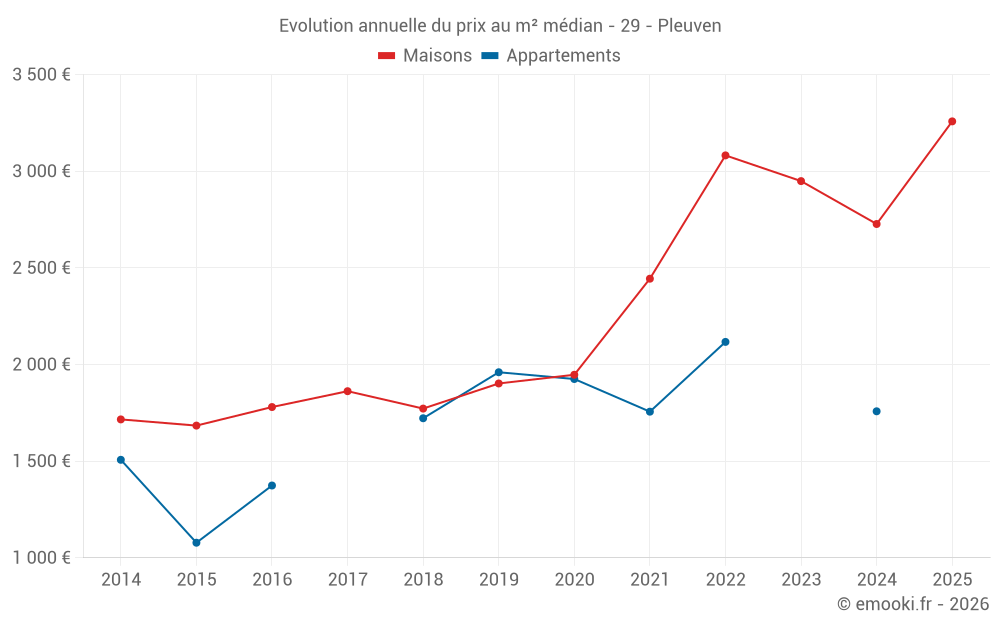 Le prix médian sur les 26 transactions de maisons des 12 derniers mois dans la commune de Pleuven était de 2 821 € par mètre carré pour une valeur foncière médiane de 295 000 €. Sur cette période 60% des transactions se sont situées entre 2 307 et 3 279 € par mètre carré (du 2ème au 8ème déciles).