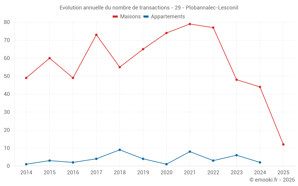 Le prix médian sur les 43 transactions de maisons des 12 derniers mois dans la commune de Plobannalec-Lesconil était de 2 445 € par mètre carré pour une valeur foncière médiane de 260 000 €. Sur cette période 60% des transactions se sont situées entre 1 509 et 3 196 € par mètre carré (du 2ème au 8ème déciles).