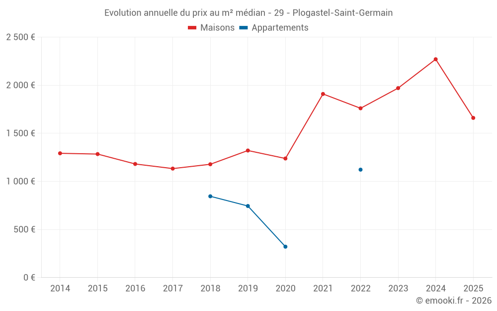 Le prix médian sur les 39 transactions de maisons des 24 derniers mois dans la commune de Plogastel-Saint-Germain était de 2 200 € par mètre carré pour une valeur foncière médiane de 214 000 €. Sur cette période 60% des transactions se sont situées entre 1 589 et 2 905 € par mètre carré (du 2ème au 8ème déciles).
