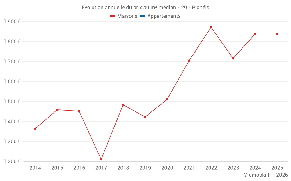 Le prix médian sur les 19 transactions de maisons des 12 derniers mois dans la commune de Plonéis était de 1 858 € par mètre carré pour une valeur foncière médiane de 203 000 €. Sur cette période 60% des transactions se sont situées entre 1 313 et 2 663 € par mètre carré (du 2ème au 8ème déciles).