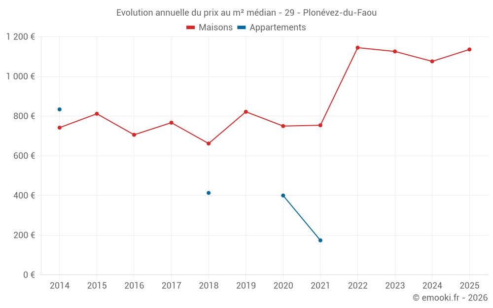 Le prix médian sur les 43 transactions de maisons des 12 derniers mois dans la commune de Plonévez-du-Faou était de 1 179 € par mètre carré pour une valeur foncière médiane de 105 000 €. Sur cette période 60% des transactions se sont situées entre 773 et 1 578 € par mètre carré (du 2ème au 8ème déciles).