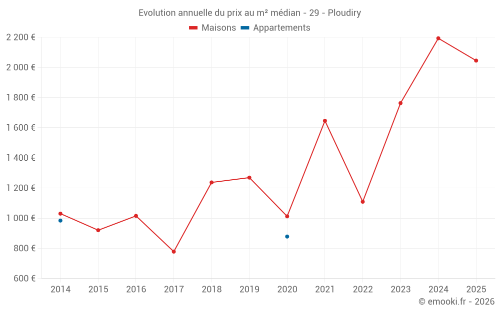 Le prix médian sur les 26 transactions de maisons des 24 derniers mois dans la commune de Ploudiry était de 2 075 € par mètre carré pour une valeur foncière médiane de 181 500 €. Sur cette période 60% des transactions se sont situées entre 1 648 et 2 440 € par mètre carré (du 2ème au 8ème déciles).