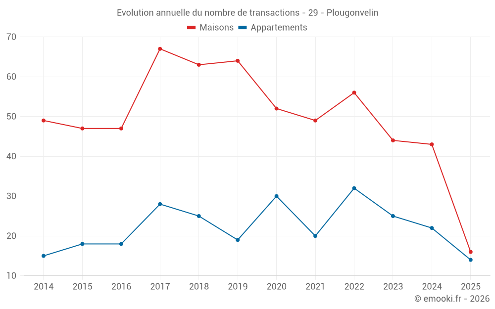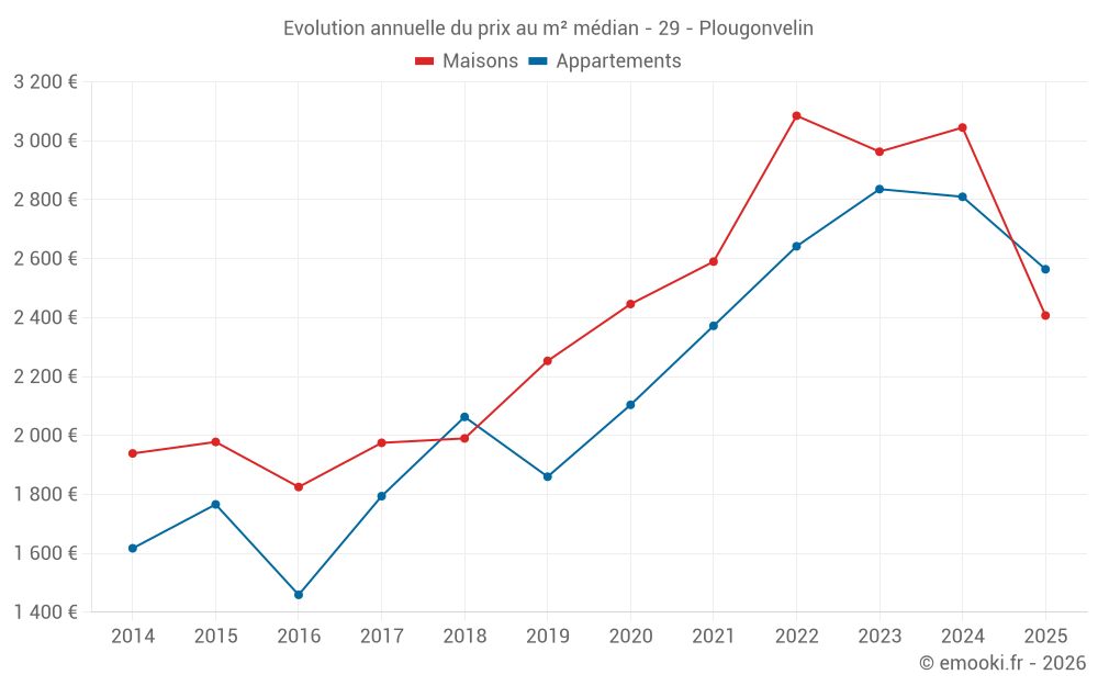 Le prix médian sur les 25 transactions d'appartements des 12 derniers mois dans la commune de Plougonvelin était de 2 593 € par mètre carré pour une valeur foncière médiane de 134 000 €. Sur cette période 60% des transactions se sont situées entre 2 052 et 3 201 € par mètre carré (du 2ème au 8ème déciles).