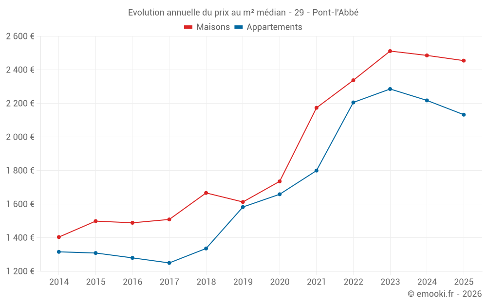 Le prix médian sur les 23 transactions de maisons des 6 derniers mois dans la commune de Pont-l'Abbé était de 2 455 € par mètre carré pour une valeur foncière médiane de 210 000 €. Sur cette période 60% des transactions se sont situées entre 1 953 et 2 906 € par mètre carré (du 2ème au 8ème déciles).