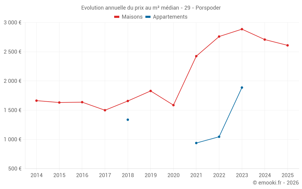Le prix médian sur les 17 transactions de maisons des 12 derniers mois dans la commune de Porspoder était de 2 639 € par mètre carré pour une valeur foncière médiane de 309 686 €. Sur cette période 60% des transactions se sont situées entre 1 812 et 3 514 € par mètre carré (du 2ème au 8ème déciles).