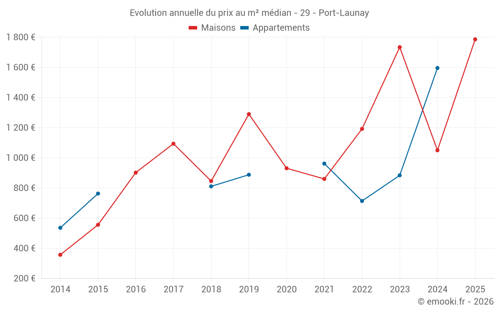 Le prix médian sur les 17 transactions de maisons des 24 derniers mois dans la commune de Port-Launay était de 1 188 € par mètre carré pour une valeur foncière médiane de 105 000 €. Sur cette période 60% des transactions se sont situées entre 950 et 1 876 € par mètre carré (du 2ème au 8ème déciles).
