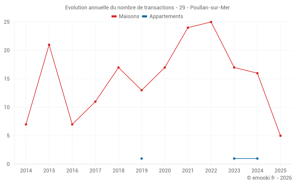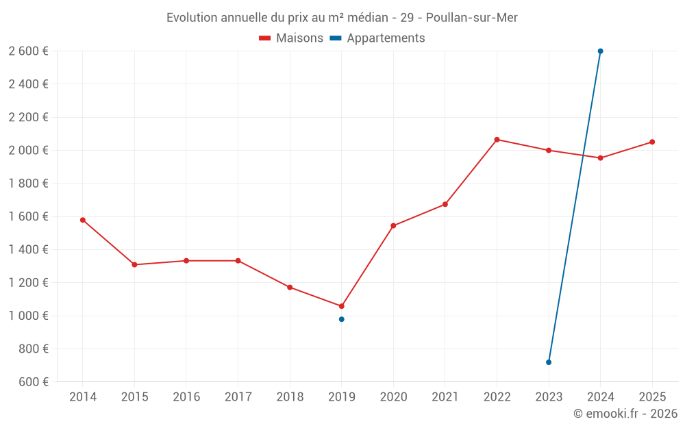 Le prix médian sur les 27 transactions de maisons des 24 derniers mois dans la commune de Poullan-sur-Mer était de 2 000 € par mètre carré pour une valeur foncière médiane de 200 000 €. Sur cette période 60% des transactions se sont situées entre 1 209 et 2 866 € par mètre carré (du 2ème au 8ème déciles).
