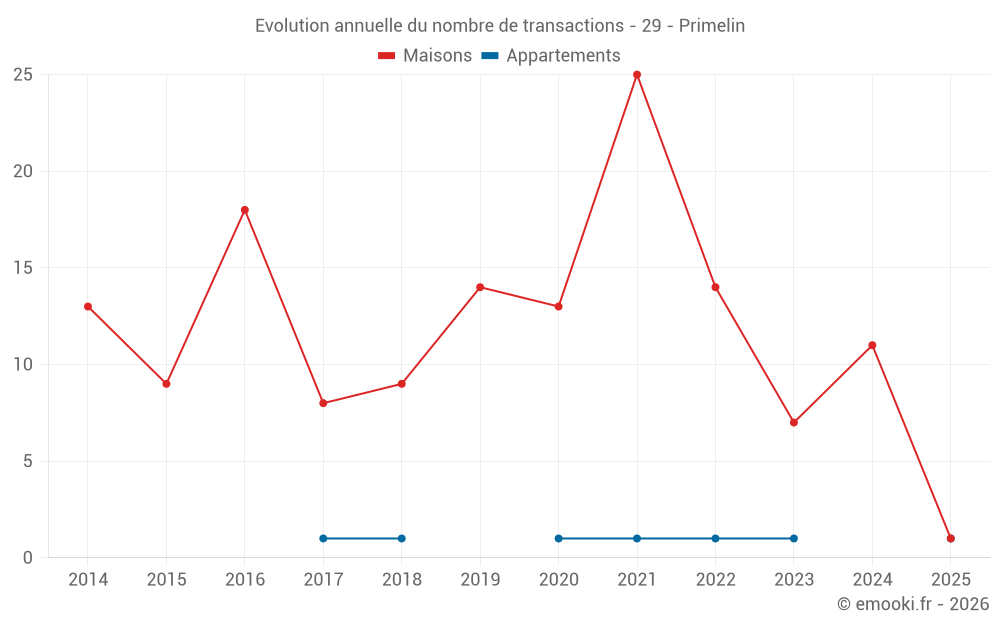 Le prix médian sur les 15 transactions de maisons des 24 derniers mois dans la commune de Primelin était de 2 275 € par mètre carré pour une valeur foncière médiane de 182 000 €. Sur cette période 60% des transactions se sont situées entre 1 251 et 2 570 € par mètre carré (du 2ème au 8ème déciles).