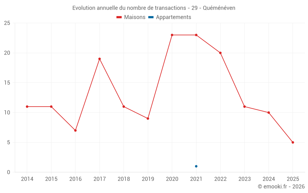 Le prix médian sur les 20 transactions de maisons des 24 derniers mois dans la commune de Quéménéven était de 1 488 € par mètre carré pour une valeur foncière médiane de 168 425 €. Sur cette période 60% des transactions se sont situées entre 1 131 et 2 052 € par mètre carré (du 2ème au 8ème déciles).