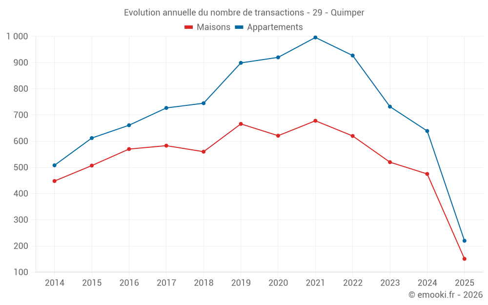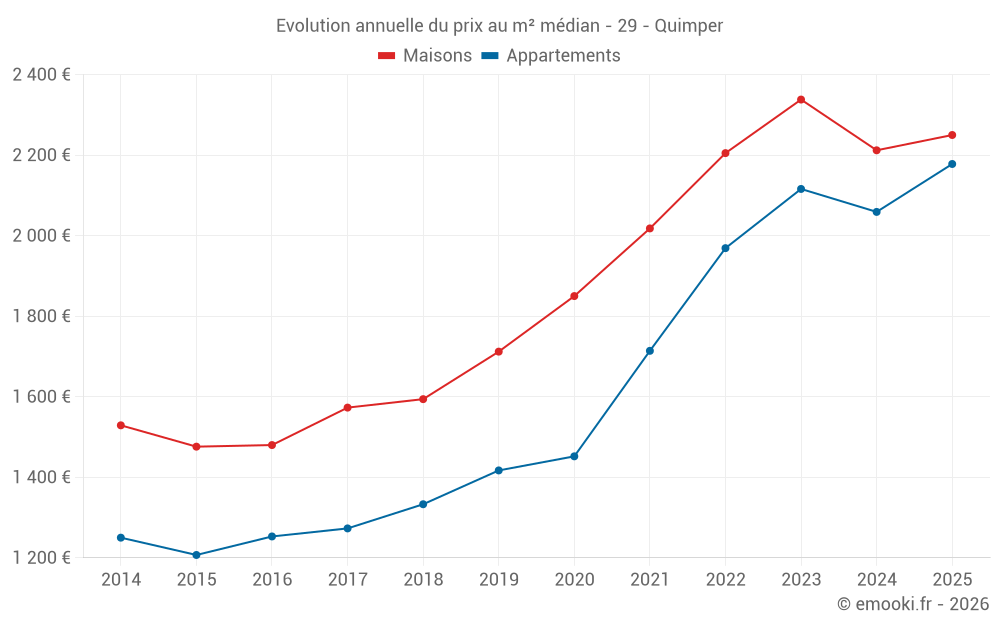 Le prix médian sur les 48 transactions de maisons des 3 derniers mois dans la commune de Quimper était de 2 218 € par mètre carré pour une valeur foncière médiane de 200 000 €. Sur cette période 60% des transactions se sont situées entre 1 850 et 2 911 € par mètre carré (du 2ème au 8ème déciles).