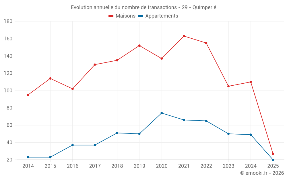 Le prix médian sur les 27 transactions de maisons des 6 derniers mois dans la commune de Quimperlé était de 2 273 € par mètre carré pour une valeur foncière médiane de 221 000 €. Sur cette période 60% des transactions se sont situées entre 1 536 et 2 528 € par mètre carré (du 2ème au 8ème déciles).