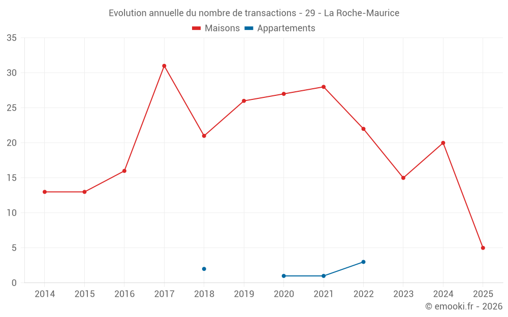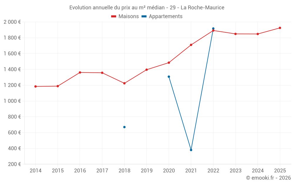 Le prix médian sur les 18 transactions de maisons des 12 derniers mois dans la commune de la Roche-Maurice était de 1 808 € par mètre carré pour une valeur foncière médiane de 170 000 €. Sur cette période 60% des transactions se sont situées entre 1 407 et 2 281 € par mètre carré (du 2ème au 8ème déciles).